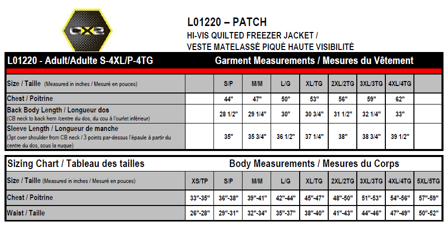 68 gsm – 2 oz./yd2 – 3.5 oz./lin. yd 100% polyester taffeta with wind resistant and water repellent finish. Insulation: 150 gsm 100% polyester. Knit Collar and cuff. Two exterior side entry pockets and one inner patch pocket. Zocket embroidery access. YKK front zipper. 4” hi-vis contrast band with 2” reflective tape on front and back body and sleeves. Meets CSA standards.
