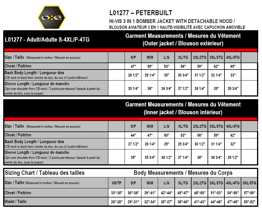 Outer jacket: 215 gsm – 6.3 oz./yd2 – 10.5 oz./lin yd 100% polyester oxford 3000 mm waterproof rating, 3000 gsm breathability rating, wind resistant and water repellent finish. Inner jacket: 68 gsm – 2 oz./yd2 – 3.5 oz./lin. yd 100% polyester taffeta with wind resistant and water repellent finish. Insulation: 180gsm 100% polyester. Exterior jacket fully seam sealed with waterproof, breathable coating. Snap detachable hood with adjustable drawcord. Chest zipper pocket and ID pocket. Lower front welt pockets with zipper closure. Adjustable tabs on sleeve cuff. Two inner patch pockets. Zocket embroidery access. Zip out insulated quilted inner jacket. Rib knit collar and cuff. Patch pockets on exterior and interior of inner jacket. YKK zippers. 4” hi-vis contrast band with 2” reflective tape on front and back body and sleeves. Meets CSA standards.